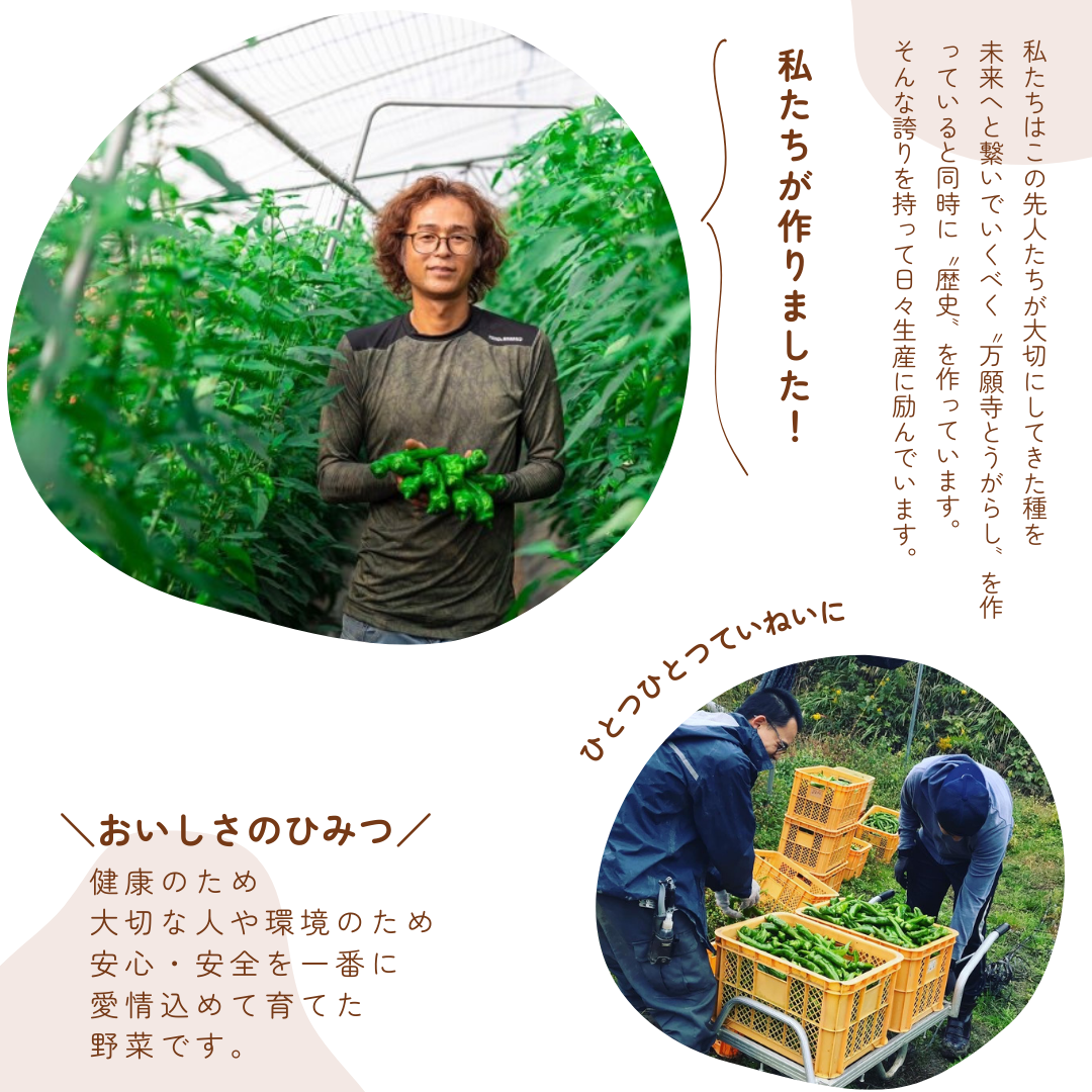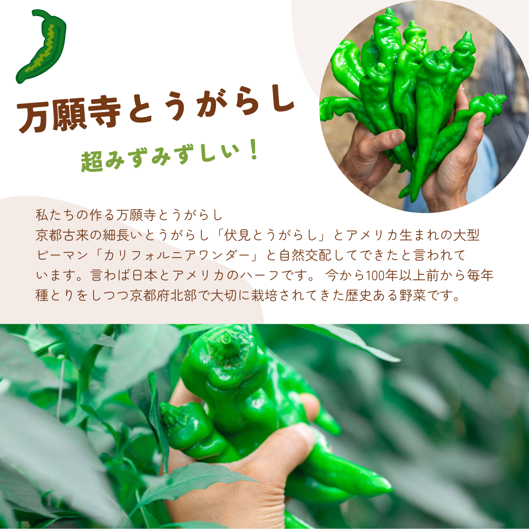 ◆About Mangetsuji Peppers: Mangetsuji peppers are a representative vegetable of Kyoto cuisine. They are characterized by their thick flesh, satisfying texture, and yet soft mouthfeel.